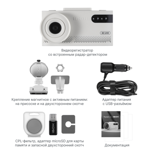 EVO 4K White — белый видеорегистратор с радар-детектором от iBOX. Это премиальное комбо-устройство — идеальный вариант для светлого салона (или кузова) автомобиля.